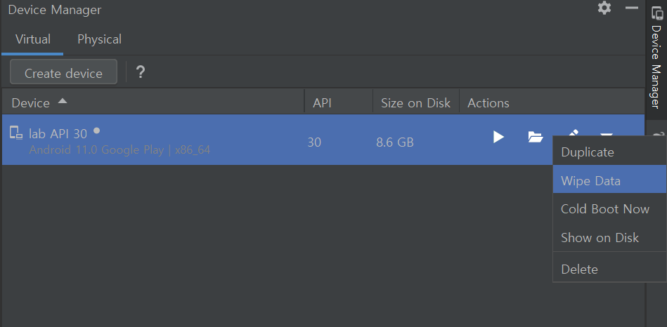 해당 카테고리에는 전공 과목 모바일 소프트웨어를 들으며 기록하고 싶은 내용을 기록하겠습니다. 앱을 처음 배워보는 학기이며 아직 무지하기에 지적과 피드백은 언제나 환영입니다. 평소와 같이 안드로이드 애뮬레이터를 실행시켰는데 계속 " Waiting for all target devices to come online" 가 뜨고 로딩이 계속됐다. 코드에 문제가 있나 했는데 그건 아니었다. 위 작업을 통해 해당 virtual machine의 데이터가 삭제된다. 이 작업을 통해 오류를 해결할 수 있다. 어떤 프로그램으로 어떤 코드를 작성하든 수많은 다양한 종류의 에러를 마주한다. 근본적인 이유가 뭔지 항상 의문이고 그에 따른 해결책은 매번 숙제다. 하나씩 정리하면서 해결하다 보면 언젠간 내 스스로 문제를 해결할 수..